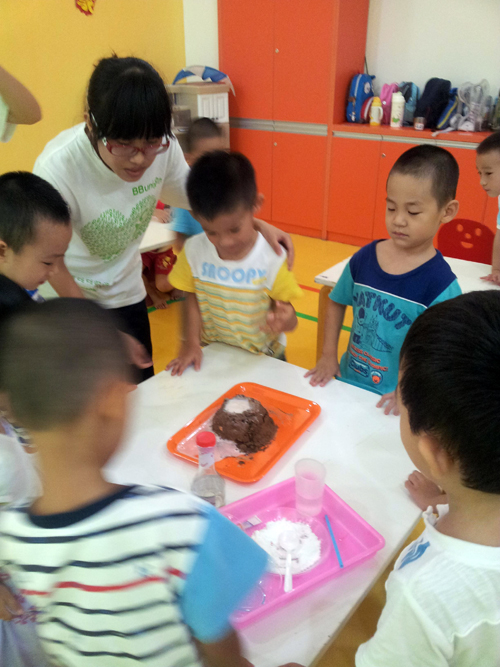 生动地有趣的科学知识课堂在孩子们的欢乐笑声中结束了,经过课堂对火山爆发这样的自然现象的了解,当老师问到火山爆发该怎么办的时候,桃子小朋友回答说会叫妈妈来保护,当当小朋友会说找武警叔叔来救命。寓教于乐,深刻阐述了BBunion的教学理念。